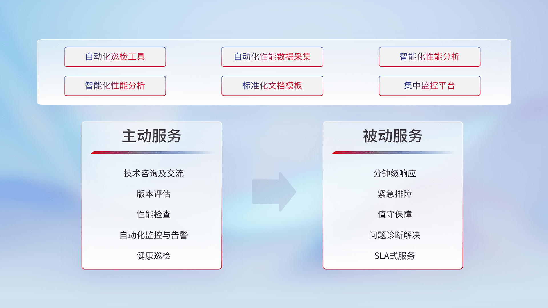 智能化工具和标准化文档,,保障服务质量,,,提供主动服务(包含技术咨询、、版本评估、、性能检查、、自动化监控与告警、、健康巡检)和被动服务包含(分钟级响应、、、、紧急排障、、、、值守保障、、、问题诊断解决、、SLA服务)。。